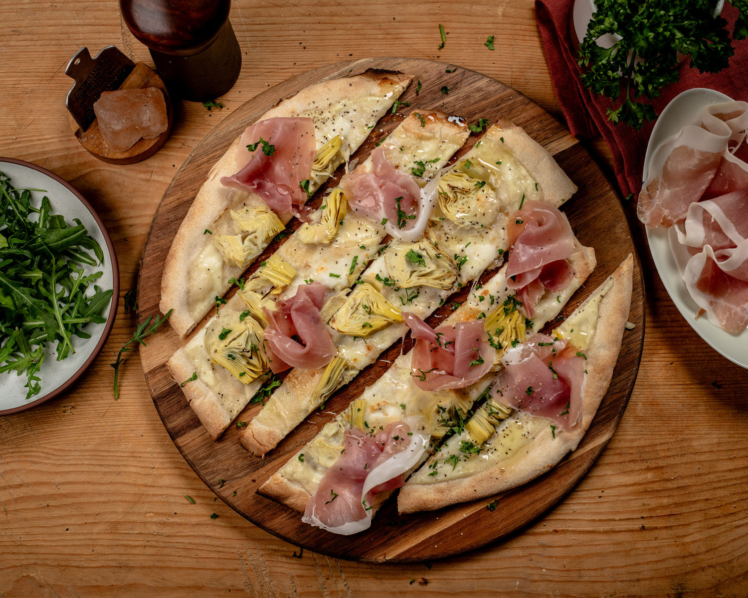 To serve, defrost base before use before topping with sauce, cheese and toppings before baking for around 2-3 minutes in a pizza oven, or around 3-5 minutes in a standard commercial oven such as a rational or other convection oven.